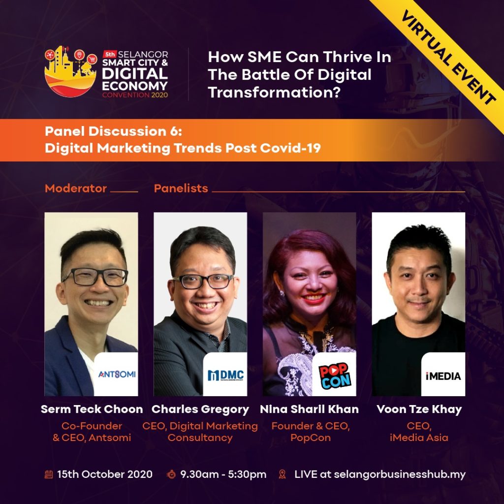Antsomi co-founder and CEO, Serm Teck Choon, was invited to moderate a webinar with the amazing panelists, including Charles Gregory, Nina Sharil Khan, and Tze Khay Voon, with the topic of “Digital Marketing Trends Post COVID-19” at the 5th Selangor Smart City & Digital Economy Convention 2020.